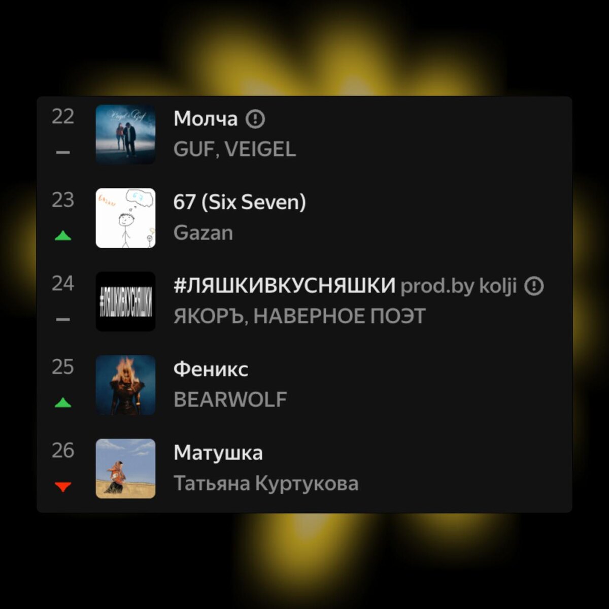 👑 🎵 Gazan с песней «67 (Six Seven)» — уже на 23-й строчке чарта Яндекс.Музыки