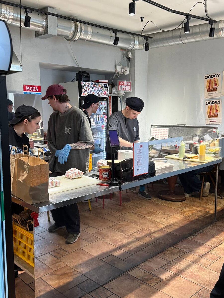 Dodgy за углом от респектабельного Olluco – не исключение. Я долго собиралась с духом, потому что «дыра в стене» откровенно не мой жанр, я даже «Митпоинт» не осилила (о чём скорее жалею), хотя условный балык экмек в Стамбуле уважаю. В выходные оказалась рядом с Dodgy и решила зайти – очереди не было, не считая нескольких заказов передо мной, а дыра в стене оказалась каморкой три на четыре с раздачей, кассой и кухней в одном флаконе. В меню штук 6 сэндвичей (долго выбирала наименее вредный по составу, тут с этим не очень, везде или жир, или сахар или всё вместе), пара закусок и «Боржоми» да Coca Cola в холодильнике. Антураж, как у нас любят выражаться, берлинский, то есть бедно и ободрано. Сэндвичи по 700-800 рублей, довольно большие, начинки в меру, продукты на удивление хорошие, вкус… на любителя жанра, но в целом – неплохо. Почему стояла очередь – не знаю, дома из продуктов с рынка можно приготовить своими руками не хуже, если, конечно, руки растут у вас из правильного места и не лен