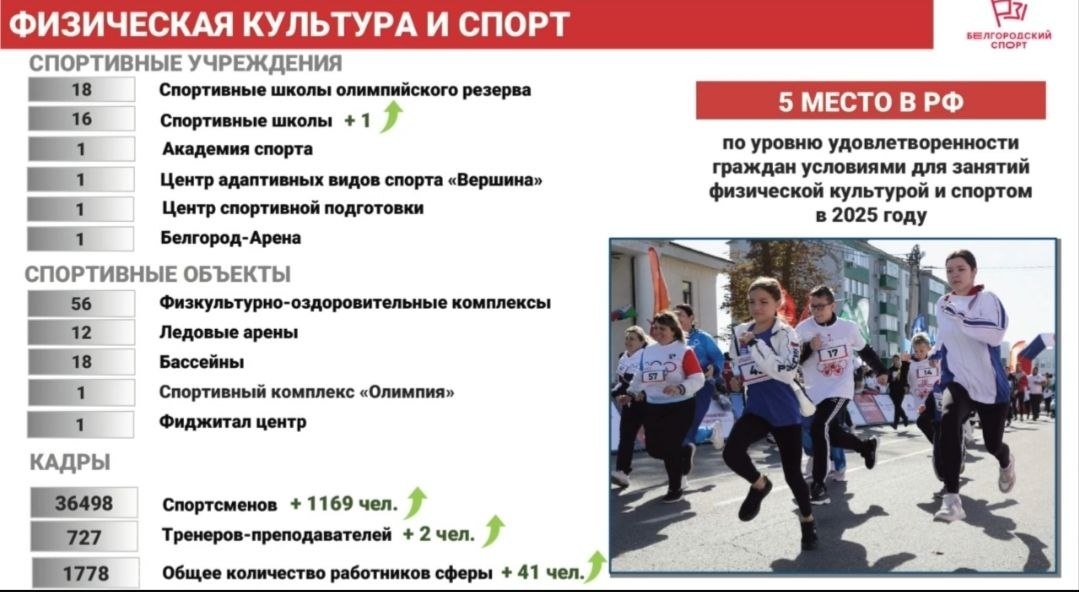 На сегодняшний день спортом регулярно занимаются 36 498 тысяч человек. В регионе работают 18 спортшкол олимпийского резерва, 16 спортивных школ, 56 ФОКов, 12 ледовых арен, 18 бассейнов, спорткомлекс «Олимпия» и фиджитал центр. Для жителей провели 3 716 спортивных мероприятий, в которых приняли участие 302 517 человек. Из-за оперативной обстановки не проводятся самые крупные мероприятия — Белгородский и Яковлевский полумарафоны. В секциях детско-юношеского спорта занимаются 35 102 ребёнка. Регион принимает участие в реализации проектов по плаванию, футболу и баскетболу. Спортивные услуги предоставляют 83 аккредитованные организации, на поддержку которых в прошлом году направили 84,2 млн рублей, а в этом году — 90 млн рублей. Это позволяет обеспечить бесплатные занятия для детей, увеличить количество соревнований и выездов. Лица с ОВЗ активно вовлекаются в адаптивный спорт. Их доля составляет 51,5%. На сегодняшний день разрабатывается модель вовлечение в адаптивную физкультуры участни