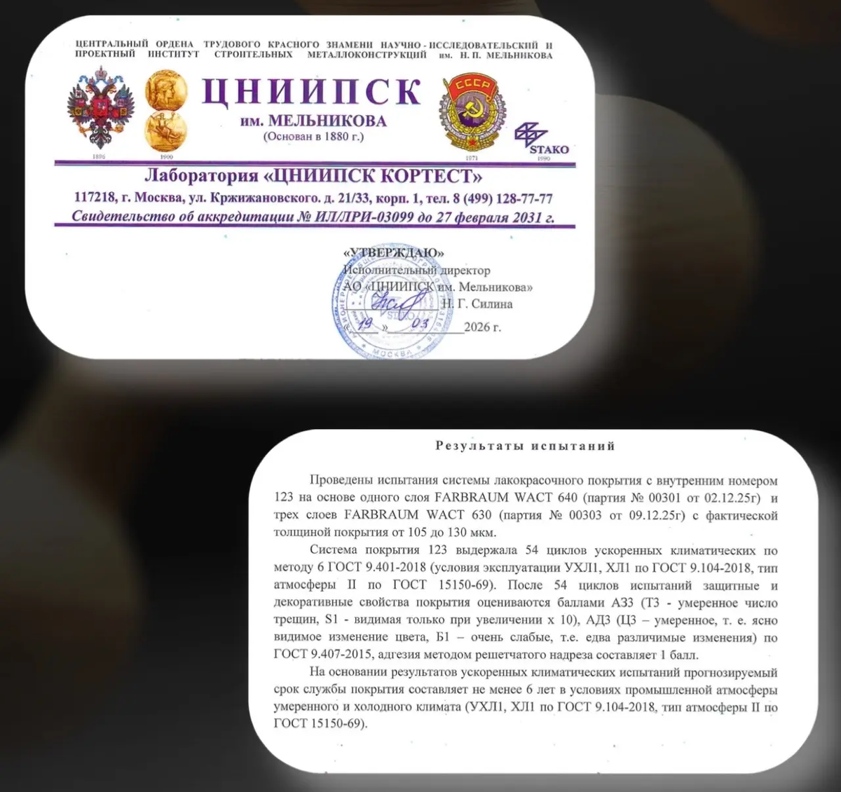 Система покрытий FARBRAUM WACT 640 + WACT 630 успешно прошла климатические испытания в ЦНИИПСК им. Мельникова. Прогнозируемый срок службы — не менее 6 лет, что является выдающимся результатом для акриловых систем по дереву. Компания FARBRAUM сообщает о новом достижении: передовая лакокрасочная система FARBRAUM WACT 640 + WACT 630 успешно прошла климатические испытания в независимой лаборатории ЦНИИПСК им. Мельникова. По результатам тестов прогнозируемый срок службы покрытия составляет не менее 6 лет в условиях промышленной атмосферы умеренного и холодного климата — это выдающийся показатель для акриловых систем по дереву. В ходе испытаний система лакокрасочного покрытия, состоящая из одного слоя FARBRAUM WACT 640 и трёх слоёв FARBRAUM WACT 630 с фактической толщиной от 105 до 130 мкм, выдержала 54 ускоренных климатических цикла. Покрытие продемонстрировало высокую стойкость: защита и декоративный вид сохраняются на долгие годы даже в сложных промышленных условиях. Долговечность системы