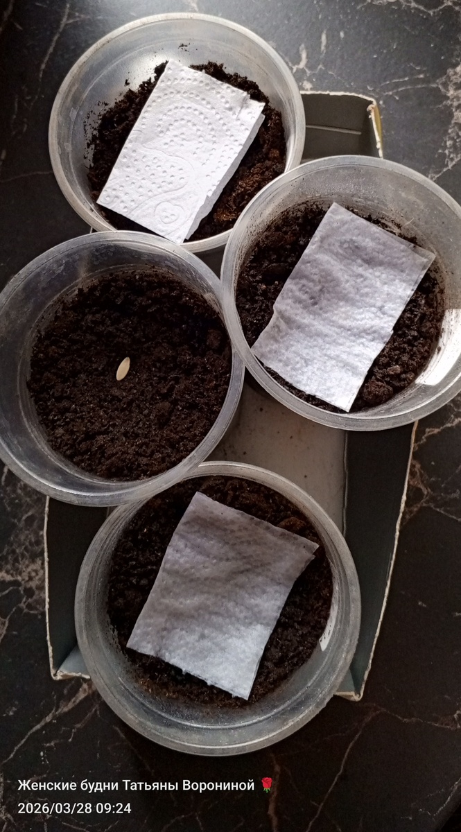 Я полюбила прозрачные стаканчики по 0,5 литра. Насыпаю грунт на 2/3 стакана, слегка, без фанатизма, уплотняю. Проливаю тёплой водой и кладу одно семечко. Сверху прикрываюего салфеткой в два, три слоя и смачиваю из пульверизатора