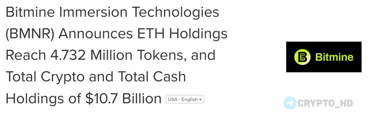 🍸 Том Ли докупил 71,179 ETH ($147m) – анонс ▪ На балансе Bitmine: 4,732,082 ETH ($10b) – примерно 3,92% от Total supply. ▪ Свободный кэш для пополнения резервов: $961m. ▪ В стейкинге: 3,142,643 ETH ($6,3b). Ранее: стейкинг для институционалов Crypto Headlines