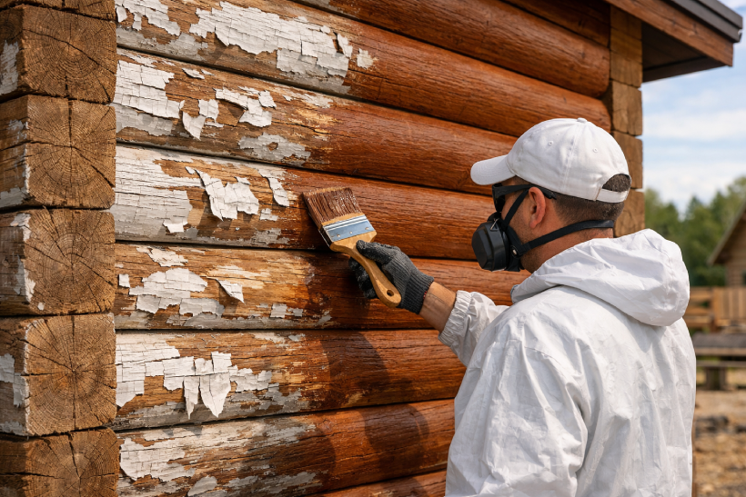 Сначала осмотрите поверхность деревянного дома или изделия. Обратите внимание на трещины, сколы, участки с отслоениями. Проведите тест на адгезию с помощью малярного скотча.