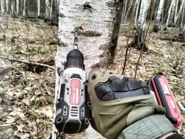 Для сбора сока желательно выбирать не молодые и тоненькие деревья, а крупные берёзы. Нужно просверлить в стволе неглубокое отверстие, не углубляясь в древесину. Лучше всего это сделать вставленным в шуруповёрт сверлом. Тогда прозрачный нектар будет стекать быстро. Если сок жёлтый, значит отверстие не глубже коры. Жёлтый оттенок придают частички берёзовой коры, попадающие в ёмкость.