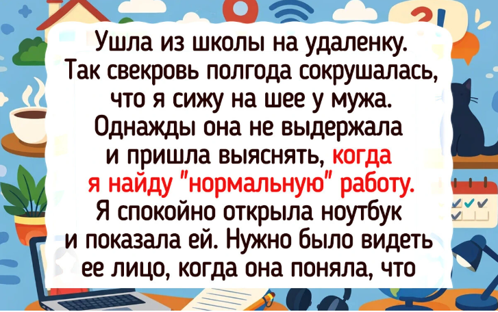- Ушла из школы на удаленку. Так свекровь полгода сокрушалась, что я сижу на шее у мужа. Однажды она не выдержала и пришла выяснять, когда я найду «нормальную» работу. Я спокойно открыла ноутбук и показала ей. Нужно было видеть ее лицо, когда она поняла, что мой заработок в онлайн-школе уже тогда в два раза превышал доходы супруга. То есть я работаю по специальности, но уже на своих условиях. Проснулась, накрасилась, надела приличный верх, включила ноутбук — и уже на работе.
