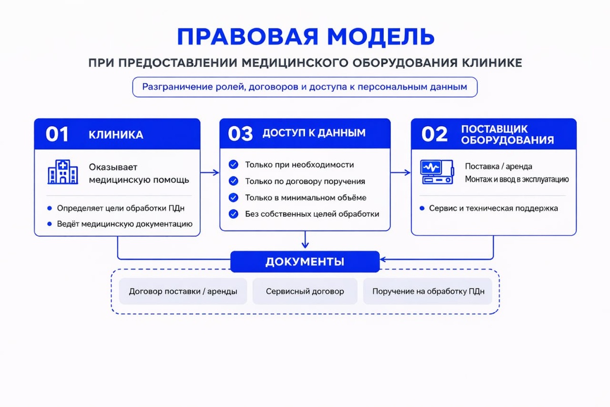 При предоставлении медицинского оборудования клинике исходной должна быть модель, при которой клиника сохраняет статус лица, определяющего цели медицинского процесса и обработки данных пациентов, а поставщик оборудования выполняет техническую функцию. Если поставщику необходим доступ к персональным данным для монтажа, настройки, сервисного сопровождения или удаленной диагностики, такой доступ должен быть оформлен как обработка персональных данных по поручению оператора. Такой подход соответствует позиции Роскомнадзора, изложенной в материале Управление Роскомнадзора по Саратовской области, «Методические рекомендации по работе с персональными данными для субъектов малого и среднего предпринимательства». ➖➖➖➖➖➖➖➖➖➖➖ Из той же позиции Роскомнадзора следует, что в поручении должны быть определены перечень действий с персональными данными, цели обработки, обязанность соблюдать конфиденциальность и обеспечивать безопасность персональных данных, а ответственность перед субъектом за действия л