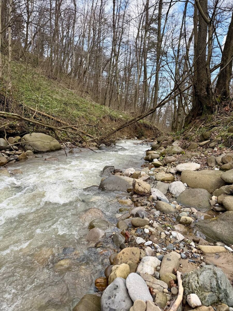 Бурный ручей с белой пеной течет среди крупных камней и обнаженных корней деревьев. Хрустальная вода и каменистое русло добавляют свежести этой лесной прогулке в окрестностях Владикавказа.