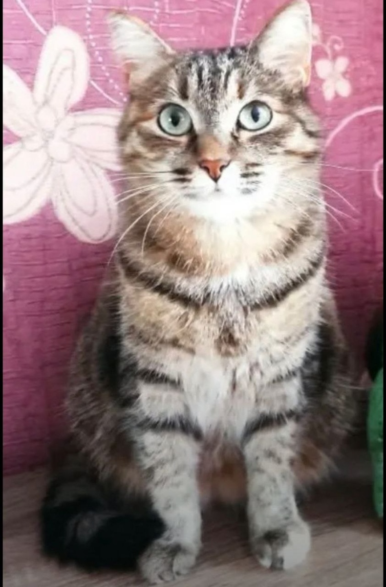 Потерялась кошка, камышовый окрас, полосатая серо-рыжеватого оттенка, маленькая рыжая полосочка на голове между ушей, на правом ухе