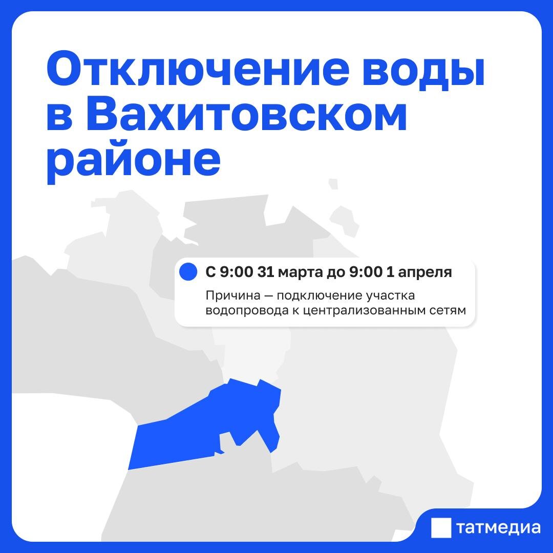 Причина – подключение участка водопровода к централизованным сетям. Воды не будет с 9:00 31 марта до 9:00 1 апреля по следующим адресам: 🔹ул.Ахтямова, 1, 6; 7, 14, 16, 18а; 18/94. 🔹ул.Габдуллы Тукая, 89, 91, 91а, 94/18, 97, 97 корп.1, 97а корп.1, 102, 102а, 104, 106а; 108, 110, 112, 112г, 114, 114а. 🔹ул.Шигабутдина Марджани, 40, 42а, 44. 🔹ул.КСКа, 3. Для жителей будет организован подвоз воды. Заявки на автоцистерны принимаются по телефону: +7(843)231-62-60. @tatmediaofficial | В Telegram наблюдаются сбои, читайте Татмедиа в MAX