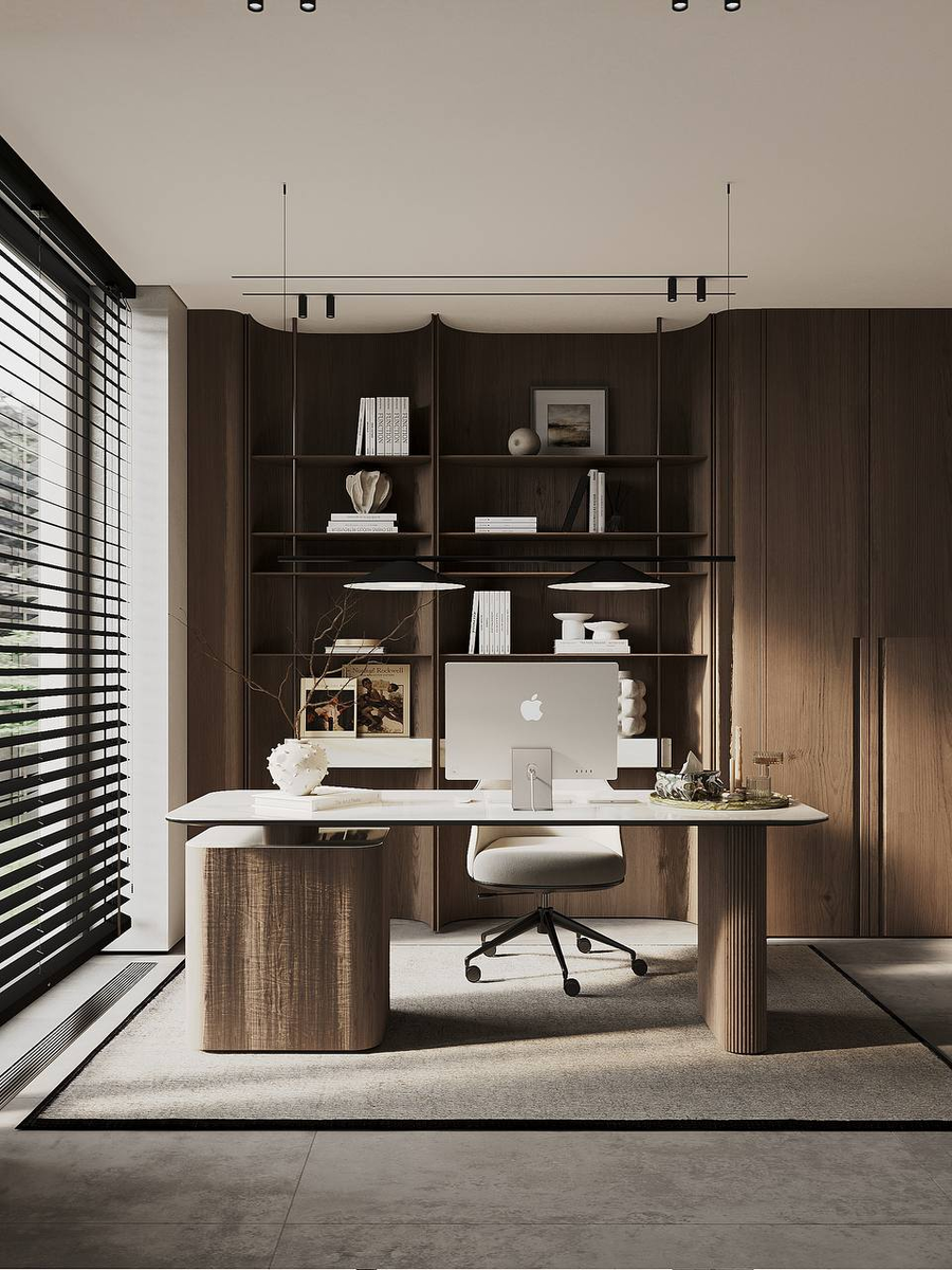 Интерьер построен на сочетании дерева и спокойной светлой базы. Панели и встроенные стеллажи формируют цельный образ пространства — без лишних деталей, но с ощущением глубины и собранности. Всё работает на достижение тишины и концентрации. Рабочее место расположено у окна: естественный свет, вид на участок, мягкие тени. Дополнительное освещение сдержанное: линейные треки на потолке и удобные подвесные светильники над столом. Этот кабинет — не про показную строгость, а про баланс: между функцией и атмосферой, между работой и возможностью замедлиться. Больше о нас и наших проектах: https://arhidom-buro.ru/