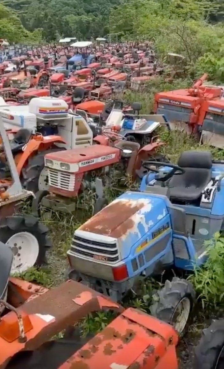 Бесконечное поле мини-тракторов для выполнения разных работ, они стоят под открытым небом и вообще никому не нужны