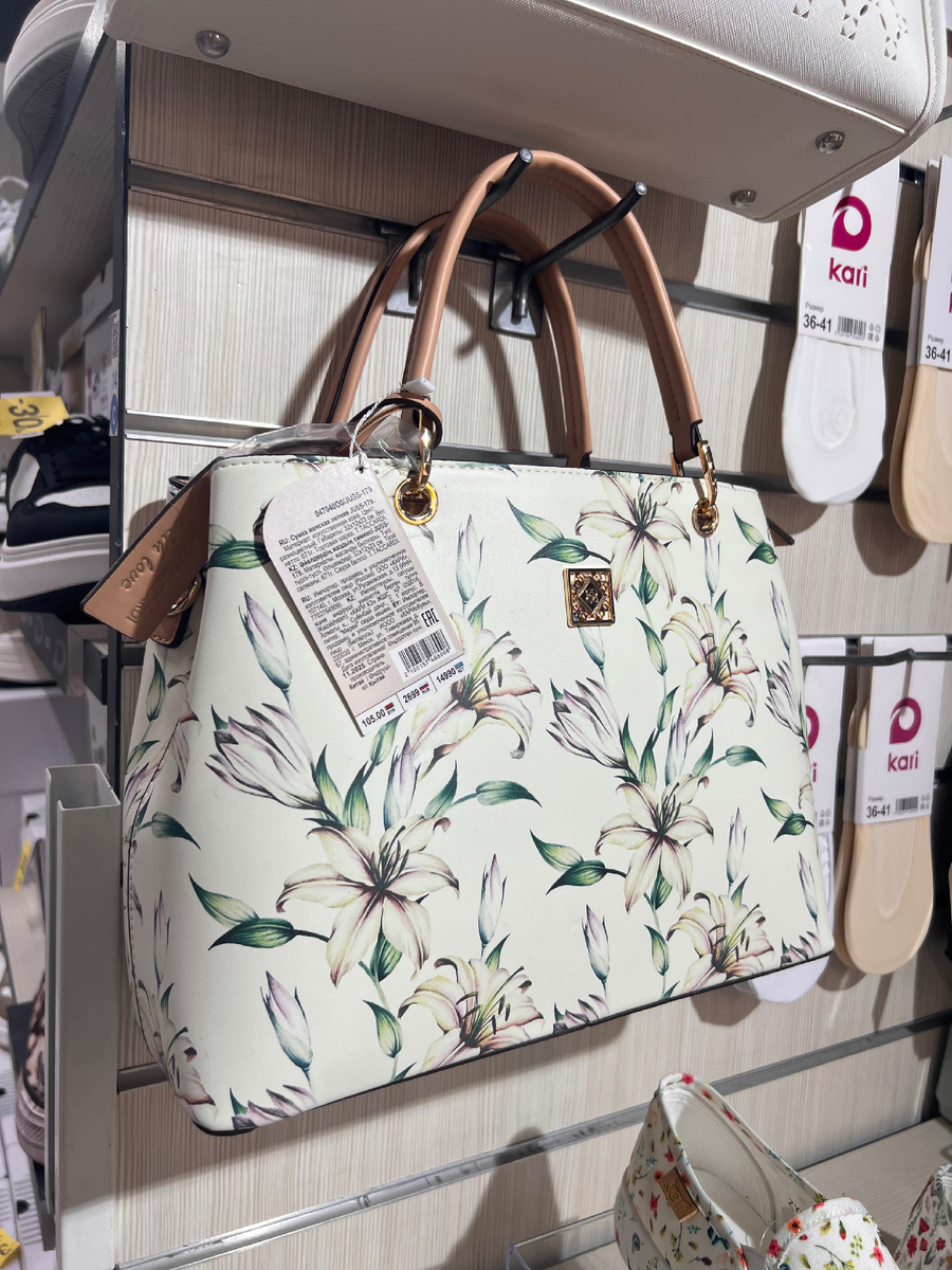 Очень нежная модель с крупным цветочным принтом. Идеально подойдет, чтобы освежить базовый гардероб. Ручки пудрового цвета выглядят добротно, а золотистая фурнитура добавляет капельку шика.