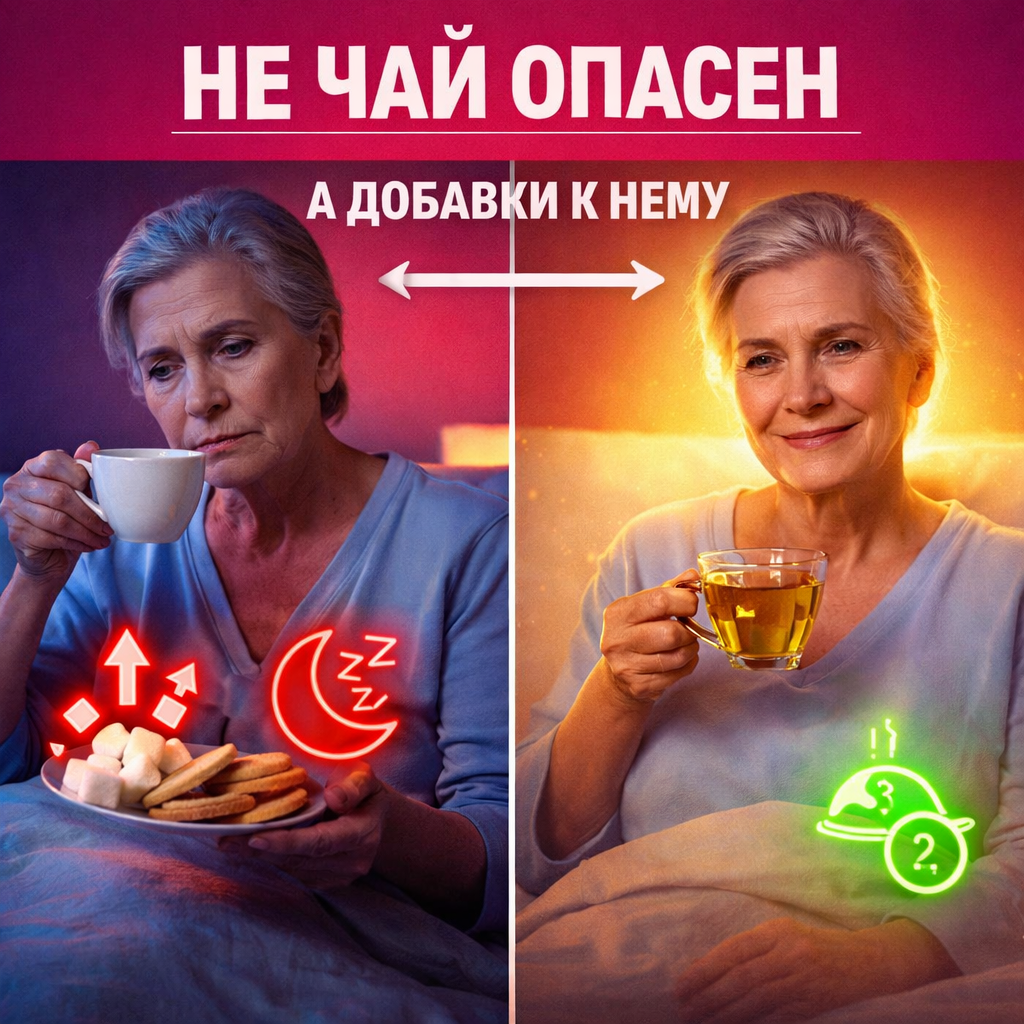 опасно то, что оказывается в чашке вместе с ним Особенно после 55. И когда начинаешь разбирать привычные вечерние добавки к чаю — становится понятно, почему утром появляются тяжесть, отёки и скачки давления. После 55 организм вечером работает иначе. Это естественно. Но важно учитывать изменения: замедляется обмен веществ
