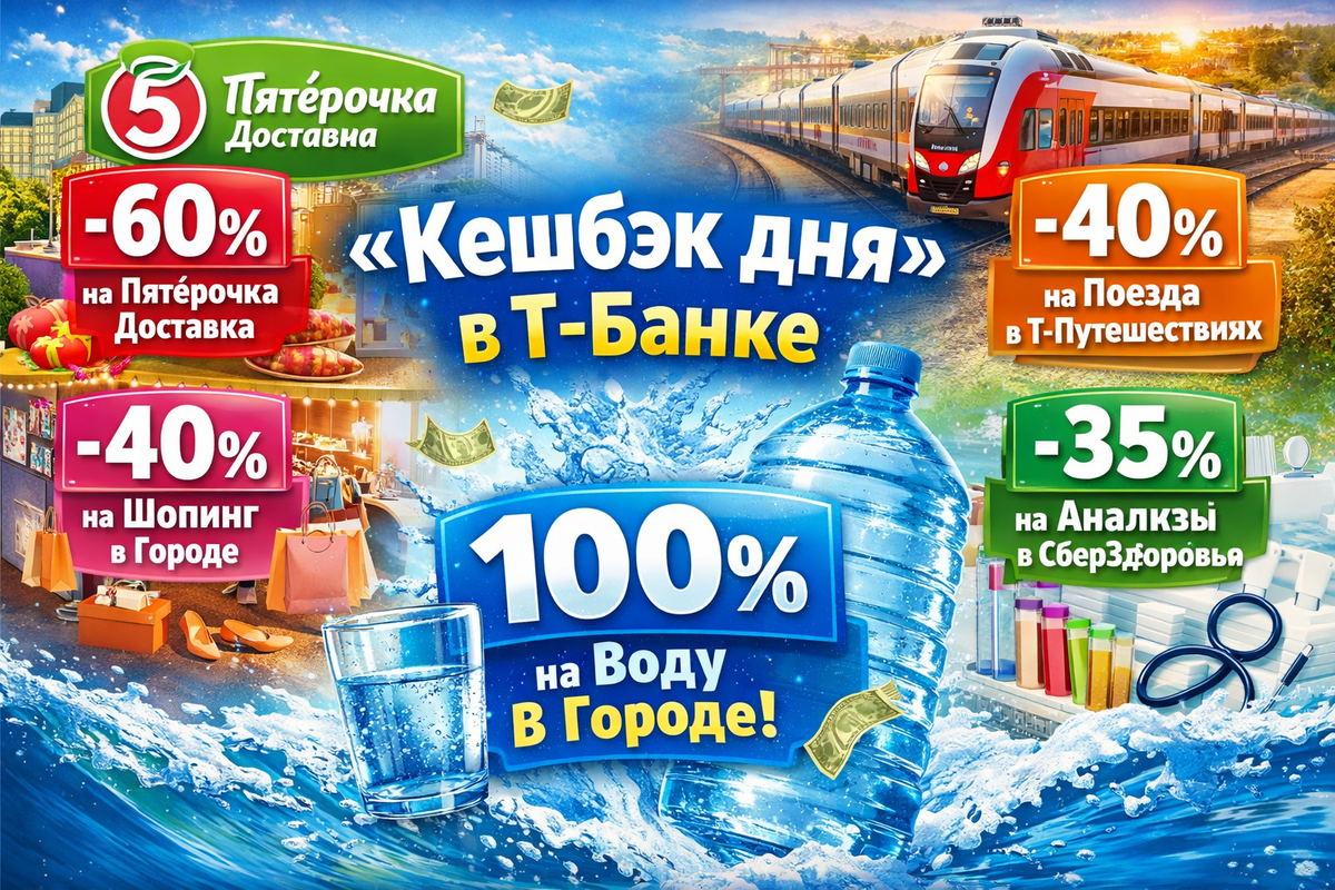 ⚡️Из интересного: 🛒 Кешбэк 60% на «Пятёрочка Доставка», при покупке от 1 000₽, макс.650 бонусов. Максимальный кешбэк будет на сумму 1 083₽. Акция действует на одну покупку Для максимальной выгоды можно совместить с промокодом из этого поста👈 🛍 Кешбэк 40% на «Шопинг в Городе», макс.600 бонусов. Максимальный кешбэк будет на сумму 1 500₽. Нельзя оплатить через сервис «Долями», QR и СБП 🚅 Кешбэк 40% на «Поезда в Т-Путешествиях», макс.1 000 бонусов. Максимальный кешбэк будет на сумму 2 500₽. Оплатить любой картой Т-Банка кроме «S7» и «Джуниор» 🛡 Кешбэк 35% на «Анализы в СберЗдоровье». Кешбэк начисляется только при оплате по ссылке 🏪 Кешбэк 100% на воду «В Городе», макс.150 бонусов. Действует при заказе через доставку в Т-Банке на питьевую воду из подборки 👀 Предложения могут быть не у всех. Проверяйте у себя в приложении Т-Банка Всем профита🔥 Если было полезно – ставьте лайк и подписывайтесь👍🏻 Подобные разборы и обновления публикую в Telegram-канале и MAX👈 Если остались вопросы