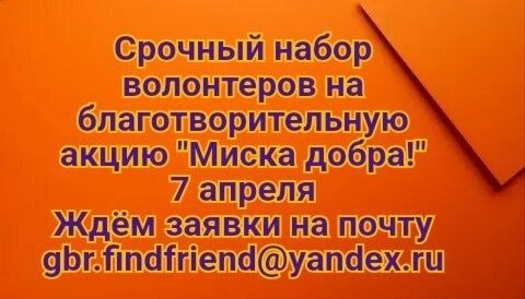 ❗️❗️❗️ Москва. Московская область. Организатор выставок «Найди друга» Центр защиты животных АНО «ГБР.Зоозащита» объявляет набор на благотворительную акцию «Миска добра» - сбор гуманитарной помощи животным без хозяина. В рамках акции возможно пристройство хвостатых участников! Акция будет проходить с 23 марта по 12 апреля, каждый день в ТЦ «Глобал Молл», Москва, м. Автозаводская, ул. Ленинская Слобода, д. 26, стр.2 Для участия возможны любые интервалы по времени с 12 до 20 часов. Но не менее 5 часов. К акции допускаются кошки, котята, щенки, собаки до среднего размера. Возможно участие котят и щенков не привитых по возрасту, но клинически здоровых! Нужно привезти для кошек свои клетки, для щенков можно клетки или манеж. Стол предоставит ТЦ. Весь собранный за день корм забирает собиравший его куратор. 1 день - 1 куратор и его подопечные. Справки из госветстанции не нужны. Заявки принимаются на почту gbr.findfriend@ya.ru. 1 дата - 1 животное - 1 письмо В теме письма - Миска добра, к