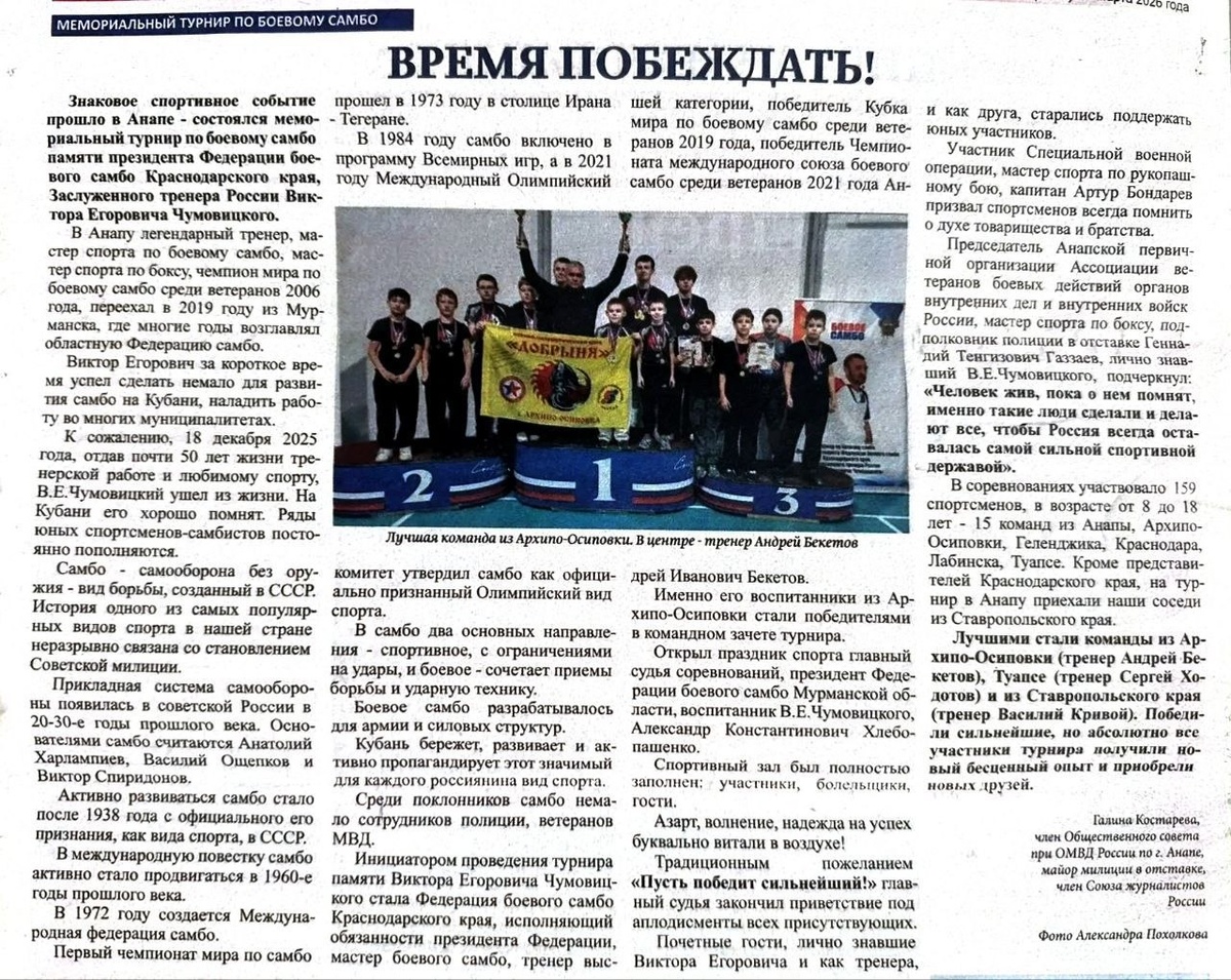 боевому самбо памяти президента Федерации боевого самбо Краснодарского края, Заслуженного тренера России Виктора Егоровича Чумовицкого. 🏆 ВРЕМЯ ПОБЕЖДАТЬ🏆 Знаковое спортивное событие прошло в Акапе - состоялся мемо— риальный турвир по боевому самбо памяти презилемта Федерации боевого самбо Краснодарскоге края, Заслуженного тренера России Виктора Егоровича Чумовицкого. В Анапу легендарный тренер. мастер спорта по боевому самбо. мастер спорта по боксу. чемпион мира по боевому самбо среди ветеранов 2006 года, персехал в 2019 году из Мурманска, где многие годы возглавлял областную Федерацию самбо. Виктор Егорович за короткое время успел сделать немало для развития самбо на Кубани, наладить работу во многих муниципалитетах. К сожалению. 18 декабря 2025 года, отдав почти 50 лет жизни тренерской работе и любимому спорту, В.Е.Чумовникий ушел из жизни. На Кубани его хорошо помнят. Ряды юных спортсменов-самбистов постоанно пополняются. Самбо - самооборона без оружия - вил борьбы, созданный в