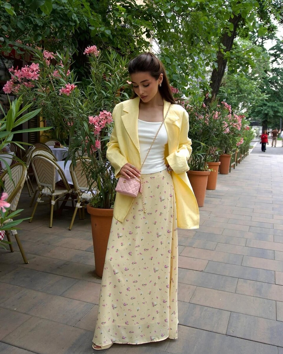 Желтый - цвет, которого многие боятся. Совершенно напрасно. В длинной юбке он работает иначе, чем в топе или платье: он не приближается к лицу, а остается внизу, создавая солнечное пятно.