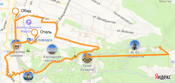 Ссылка на трек маршрута Кисловодск: https://yandex.ru/maps/?um=constructor%3A136a0baf841f3699a8ae2baa80a6469ebeed1a446078b506642ff937f90b67ab&source=constructorLink