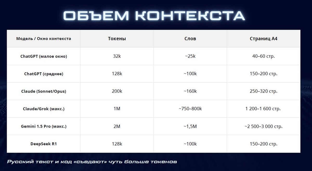 🤨Почему нейросеть "тупит" в середине длинного разговора? Потому что у неё кончается память. Это и есть контекстное окно. Представьте, что вы учите нового сотрудника тонкостям профессии. После часа разговора, он начнёт путаться, менжеваться и подбешивать вас. Он не тупой. просто объем информации большой, а мозг маленький😁 Ученик забывает, что было в начале. У нейросетей также. Чем больше окно - тем длиннее и сложнее задачи она может держать в голове одновременно. Смотри на картинку 👆 Например: 1️⃣ChatGPT в базовом режиме - 32k токенов (~40–60 страниц А4). 2️⃣ Claude и Grok на максимуме — 1 миллион токенов (это 1 200–1 600 страниц!). 3️⃣ Gemini 1.5 Pro - вообще 2 миллиона. Можно скормить пару книг. Лайфхак: Если работаешь с большими документами, кодом или длинными переговорами - выбирай модель с большим контекстом. P.S. Великий и могучий Русский текст "съедает" токены быстрее, чем английский 😉 Сохраните пост - пригодится когда будете выбирать нейросеть под задачу. 👉 [Max] [В