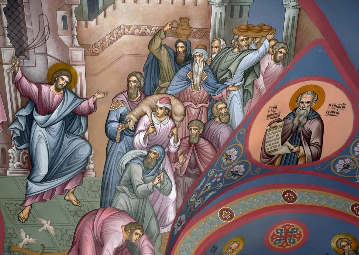 В евангельских событиях первых дней Страстной седмицы рядом со смоковницей стоит и другое грозное действие Христа – очищение Иерусалимского храма. Евангелие говорит: Господь, войдя в храм, «начал выгонять продающих в нем и покупающих», опрокинул столы меновщиков и сказал: «дом Мой домом молитвы наречется для всех народов; а вы сделали его вертепом разбойников» (Мк. 11:15-17; Мф. 21:12-13). Это не случайная вспышка гнева и не второстепенная подробность последних дней перед Крестом. Перед страданиями Христос открывает, что не может быть мирного соглашения между святыней и торгом. Здесь особенно важно услышать именно слова Спасителя. Он не говорит просто о нарушении порядка или о неподобающем шуме. Он говорит о доме молитвы. То есть речь идет не о внешней неаккуратности, а о подмене самого смысла храма. Место, предназначенное для стояния перед Богом, для молитвы и ожидания Мессии, оказалось занято расчетом, удобством и делом, которое внешне могло казаться даже полезным, но уже заслонило г