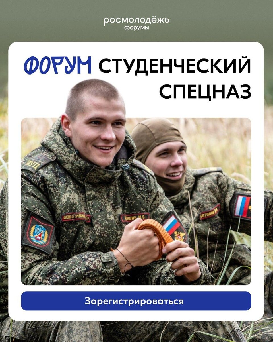 Регистрация уже открыта, она продлится до 3 апреля — присоединяйтесь к «Студенческому спецназу» по ссылке🔗 Когда форум: с 3 по 7 июня Что будет: образовательная площадка, которая объединит 200 представителей молодёжи Центрального федерального округа. Программа построена по трём направлениям: 💚 для представителей военно-патриотических клубов — практические занятия по огневой и тактической подготовке, инженерному делу, управлению БПЛА, лекции по военной истории России. Итог — суточная военно-тактическая игра, где полученные навыки применят на практике; 💚 для участников СВО, имеющих опыт наставничества, — семинары по вопросам нацбезопасности, истории России, а также знакомство с практикой участия ветеранов в патриотическом воспитании молодёжи; 🗣для военкоров и молодёжи — знакомство с основами военной журналистики, спецификой работы в зонах специальных операций, изучение этики освещения военных тем. Будут практикумы по созданию репортажей, фото- и видеосъёмке в полевых условиях.