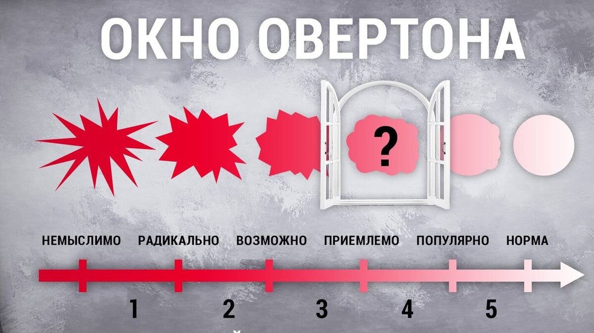 Технология окна Овертона была названа в честь американского ученого и психолога Джозефа Овертона, который, изучив технологию влияния на человеческий разум, в 90-е года написал научную диссертацию на данную тему. На самом деле, он просто рассказал методику, созданную много веков назад и эффективно работающую по сей день. Просто в современном мире, появилось множество нововведений, а, следовательно, и возможностей более быстрого влияния на массы людей. Джозеф Овертон изучил методику дегуманизации человека и объяснил, как пошагово переформировывать человеческое восприятие к неприемлемому, отвратительному и постыдному в нормальное, общесоциальное и даже престижное. Телеграм-канал Александр Семченко