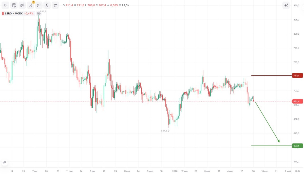 » Тикер: #LSRG Идея: Short ⬇️ Срок идеи: 2-3 недели Цель: 603,2 руб. Потенциал идеи: 11,55% Объем входа: 6% Стоп-приказ: 722,8 руб. 🧳 Технический анализ Бумага вновь проявляет силу нисходящего тренда — после длительной аккумуляции состоялся пробой ключевого. Консолидация под сопротивлением подтверждает приоритет продавцов и открывает потенциал для продолжения снижения. При объеме позиции в 6% и выставлении стоп-заявки на уровне 722,8 руб., риск на портфель составит 0,36%. Соотношение прибыль/риск составляет 1,93. 🏠 Фундаментальный фактор #ЛСР — один из крупнейших российских девелоперов, специализирующийся на строительстве и продаже жилой недвижимости в Санкт-Петербурге и Москве. Высокая ключевая ставка ЦБ оказывает давление на доступность ипотеки, что сдерживает спрос и осложняет запуск новых проектов по всему сектору. 🤖 AI-скринер Проверьте инвестиционную идею по LSRG с помощью искусственного интеллекта 📲 «Финам» в MAX ❗️Данная информация не является индивидуальной инвестицио