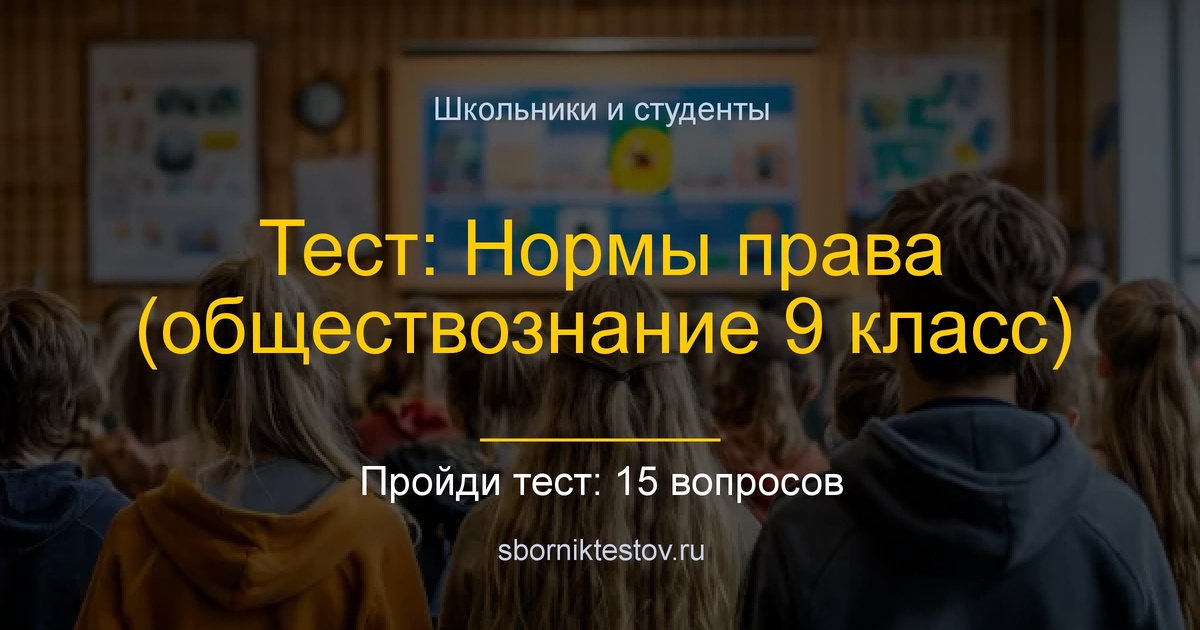 ) Проверь свои знания о правовых нормах — основе всей правовой системы! Сможешь ли ты разобраться в структуре норм права, их видах и особенностях? Этот тест по обществознанию для 9 класса поможет оценить твоё понимание того, как работают гипотеза, диспозиция и санкция, чем различаются управомочиваю... 15 вопросов · Тест на знания Уже прошли: 860 человек ▶️ Пройти в Телеграм ▶️ Пройти в MAX 🌐 Пройти на сайте СборникТестов