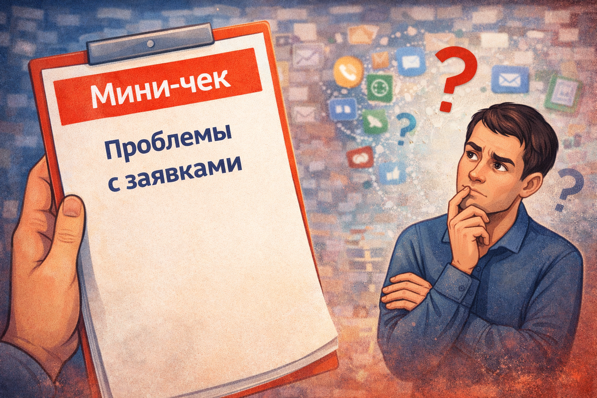 Ко мне приходят предприниматели с разными запросами. Кто-то жалуется на дорогую рекламу. Кто-то — на плохой сайт. Кто-то — на слабый отдел продаж. Но за всеми этими проблемами стоит одна: не хватает заявок. Или кажется, что не хватает. Потому что иногда заявок достаточно, но они «не те». А иногда заявок много, а продаж всё равно нет. В этой статье — короткий чек-лист на 10 вопросов. Пройдите его за 3 минуты и поймите: есть ли у вас проблемы с заявками и какие именно. На каждый вопрос отвечайте «да» или «нет». В конце посчитайте количество ответов «нет» — они укажут на зону роста. Поехали. Вопрос 1. Я знаю, сколько заявок пришло на прошлой неделе (цифрой, а не «вроде бы нормально»)? Вопрос 2. Количество заявок за последние 3 месяца не снижается (стабильно или растет)? Вопрос 3. Я знаю, сколько стоит привлечение одной заявки (CPA)? Вопрос 4. Стоимость заявки (CPA) не выросла за последние 3 месяца? Вопрос 5. Отдел продаж (или я сам) успевает обработать все заявки в день поступления? Вопр