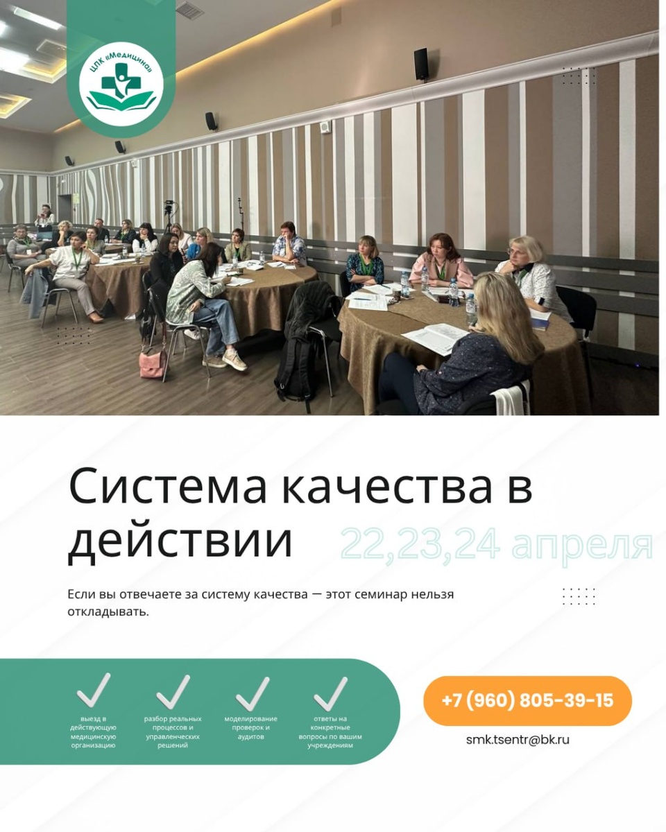 — либо существует только в документах. И это становится очевидно в первые минуты любой проверки. 📍 22–24 апреля мы проводим очный практический семинар, где разбираем систему качества не в теории, а в действии. Что вас ждет на обучении: — выезд в действующую медицинскую организацию; — разбор реальных процессов и управленческих решений; — моделирование проверок и аудитов; — работа с документами (в том числе с вашими); — ответы на конкретные вопросы по вашим учреждениям. 🎯В результате вы понимаете: что именно должно быть выстроено, как это работает в реальности и с чего начинать внедрение. Важно: мы работаем в малых группах, чтобы можно было не просто посмотреть, а разобрать и задать вопросы. Поэтому количество мест ограничено. Сейчас действует раннее бронирование. Если вы планировали участие — лучшее решение — зафиксировать место сейчас. 📞 +7 (960) 805-39-15 📧 smk.tsentr@bk.ru