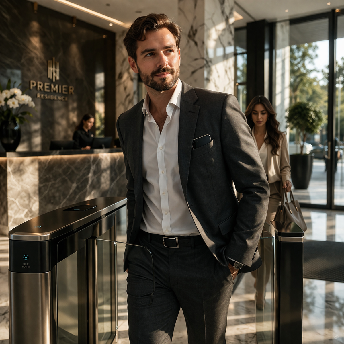 Резидент подходит к входной группе. Смартфон, находясь в кармане или сумке, взаимодействует с BLE-маяком, установленным на турникете или в лифтовом холле. Система идентифицирует владельца, сверяет его с базой данных и даёт команду на открытие прохода. Всё занимает 1–2 секунды, жилец не совершает ни одного лишнего действия.