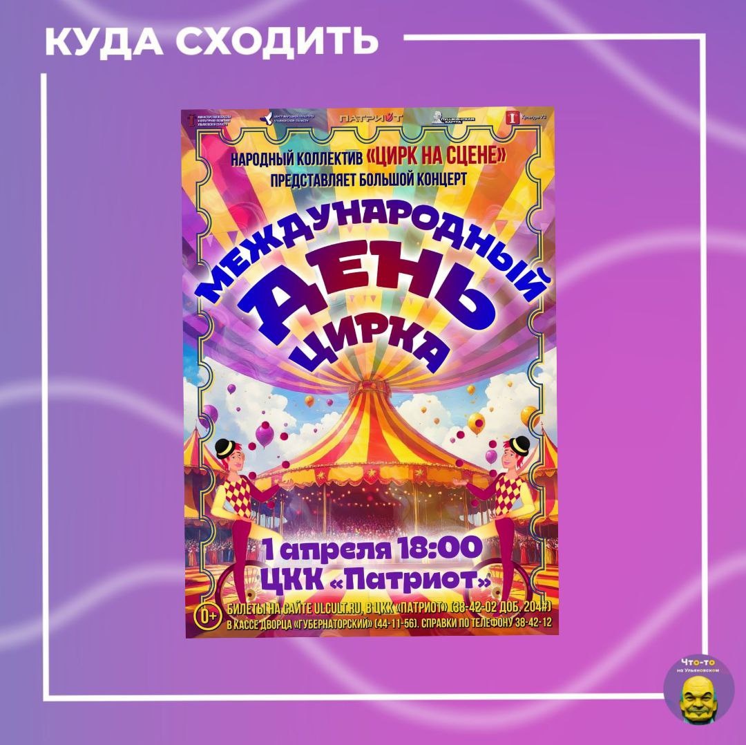 »🎉 Настоящий праздник смеха и циркового искусства подарят новые звезды и ветераны коллектива, чей труд и преданность искусству являются примером для подражания. Вас ждут массовый номер-парад «Алле», открывающий программу и демонстрирующий единство и сплоченность всех поколений артистов студии, грациозная воздушная гимнастика на трапеции и полотнах от самых юных участниц, композиция на римских кольцах «Тёмная ночь» и акробатическое трио «Три танкиста», посвященные героизму советских солдат в годы Великой Отечественной войны и исполненные под бессмертные мелодии. 📅Когда: 1 апреля в 18:00 📍Где: Центр "Патриот" (проспект 50-летия ВЛКСМ, 15) #куда_пойти_ул