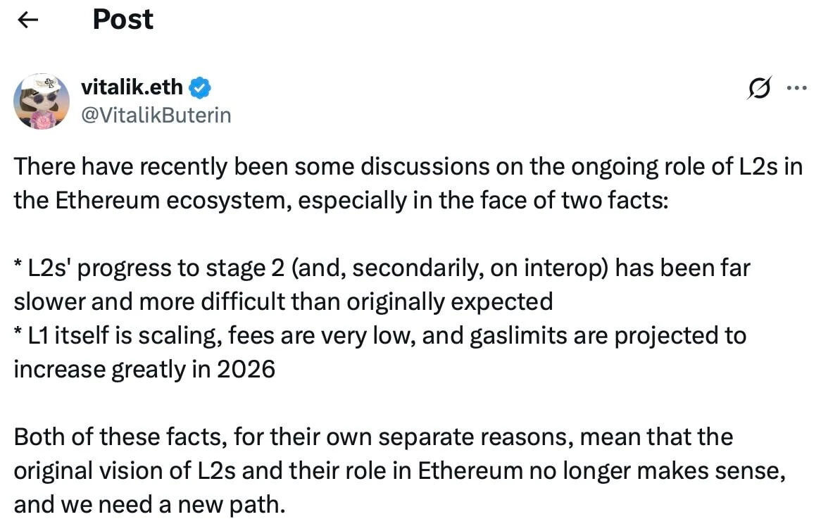 Виталик Бутерин заявил, что первоначальная концепция сетей второго уровня L2 для Ethereum больше не имеет смысла