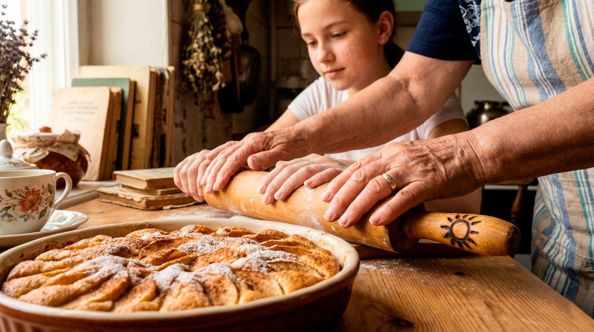 За столиком у окна сидела седая, но всё такая же улыбчивая Нина Васильевна. Перед ней стояла чашка чая с чабрецом и щедрый кусок той самой шарлотки. Она с гордостью смотрела, как её внучка ловко и нежно вымешивает тесто, припудривая стол мукой.