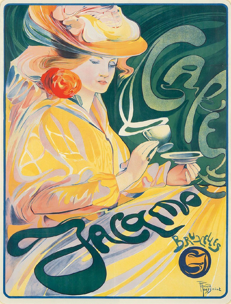 Покажу, как от рекламы получать удовольствие. Годная реклама - двигатель торговли. Реклама бывает интересная и унылая, ужасная и шедевральная. Научу вас разбираться в ней и находить красоту. Сегодня не будет мега оригинальных и креативных работ. Сегодня я хочу заострить внимание на художественной ценности рекламы. Сегодня будет праздник цвета, графики и мастерства плакатистов прошлого. Каждая из этих работ - произведение дизайна/живописи и просится как постер на стену музея современного искусства. Читатели, с тягой к прекрасному, уже давно читают телеграм-канал: Всё, что выходит в телеграме и не попадает в Дзен, вы можете читать в моём канале в МАКсе. Добро пожаловать... *** Начнём же любоваться искусством рекламы. Перед вами знаменитый рекламный плакат «Café Jacqmotte», созданный бельгийским художником Фернаном Туссеном (Fernand Toussaint) в 1896 году. Работа выполнена в стиле Ар-нуво (модерн), который был популярен в конце XIX века и характеризуется плавными линиями и декоративностью