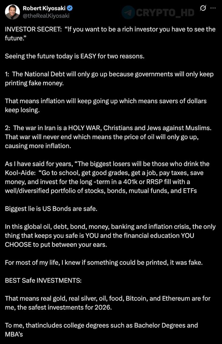 Сегодня видеть будущее легко по двум причинам: 1. Государственные долги будут только расти, так как правительства продолжают печатать «фейковые» деньги. Это означает дальнейший рост инфляции, и те, кто хранит сбережения в долларах, продолжают терять покупательную способность. 2. Война в Иране – это «священная война»: христиане и евреи против мусульман. Этот конфликт никогда не закончится, а значит цены на нефть будут только расти, усиливая инфляцию. Кто проиграет больше всех? Те, кто до сих пор верит в классическую формулу успеха: Учись → получай хорошие оценки → устройся на работу → плати налоги → копи деньги → инвестируй в «диверсифицированный» портфель из акций, облигаций и ETF. Главная ложь этой системы – что гос. облигации США надежны. Что на самом деле защищает? В условиях глобального кризиса вас спасет не банк и не государство – только вы сами и то финансовое образование, которое вы выбираете. Я убежден в одном принципе всю жизнь: если что-то можно напечатать – это НЕ наст
