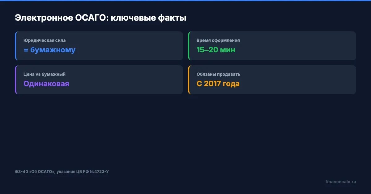 Разница — в удобстве. Бумажный полис нужно оформлять в офисе, стоять в очереди и хранить в бардачке. Электронный приходит на email за несколько минут. Его можно показать с экрана телефона или распечатать — оба варианта законны (указание ЦБ РФ №4723-У, ФЗ-40 «Об ОСАГО»).