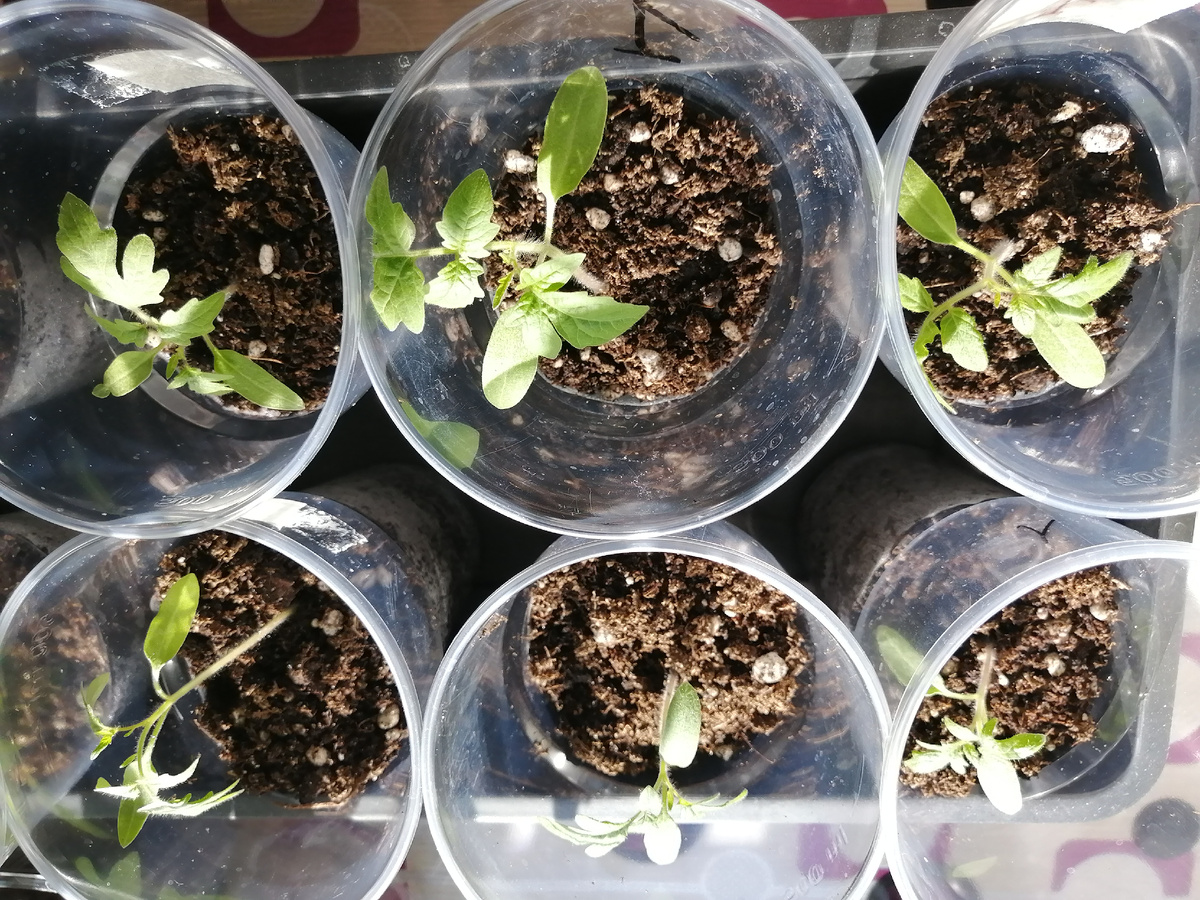 Стаканчики можно поставить в контейнеры, в этом году ещё поставила в цветочные кашпо (удлинённые), так как два контейнера уже под рассадой черенков бегонии. Иногда ставила эти стаканчики в крышки из-под торта или в коробки из-под обуви. В контейнерах легче переставить, чтобы полить или поменять наклонившиеся на солнышке растения другой стороной (переставляю почти ежедневно на ранней стадии рассады, большие раз в три дня).