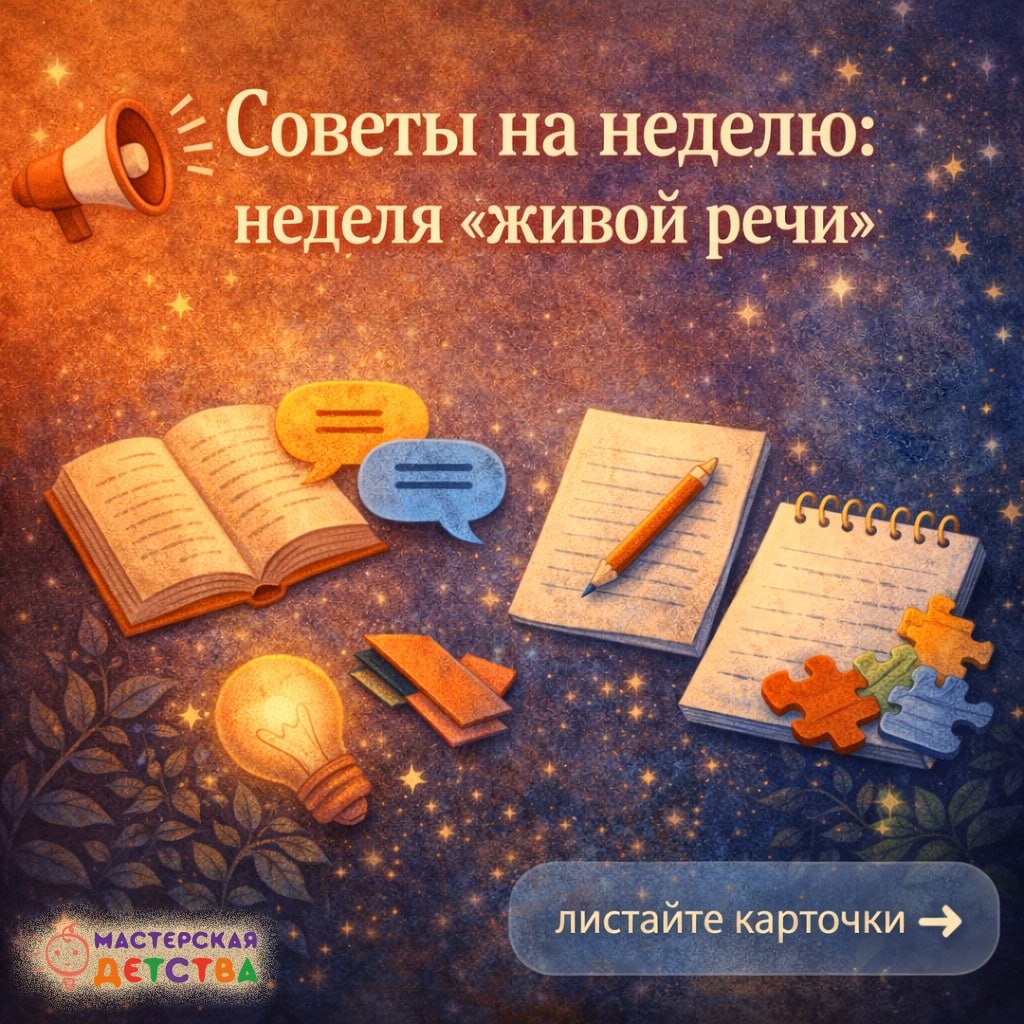 » Тема речи у нас поднимается довольно часто. И это не случайно, ведь она действительно одна из ключевых в развитии ребёнка. Потому что речь — это не только слова. Это мышление, понимание, способность договариваться и выражать себя. Поэтому в этот раз мы решили сделать её темой недели и посмотреть на развитие речи через повседневное общение. Листайте карточки ➡️ А в конце недели попробуйте ответить себе на один вопрос: стал ли ребёнок чаще говорить, подробнее отвечать и увереннее формулировать мысли? 💬 Если да — значит, вы на правильном пути. #МастерскаяДетства