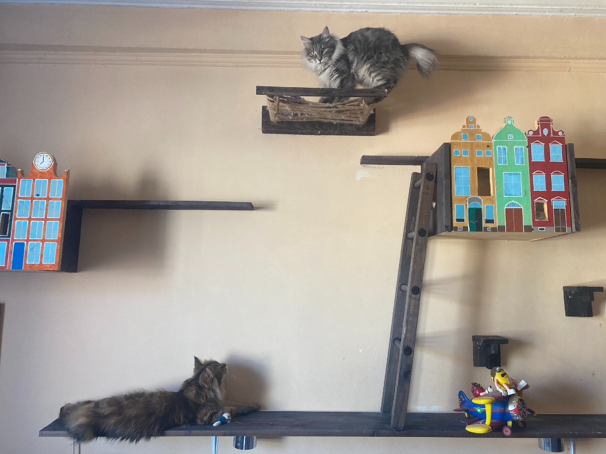Решение — трёхмерное пространство. Кошки живут не только в горизонтальной плоскости, как мы. Они активно используют высоту. Полка на стене на уровне двух метров для кошки — это совершенно отдельная территория, никак не пересекающаяся с тем, что происходит на полу. Именно поэтому два кота могут мирно сосуществовать в маленькой квартире: один «владеет» нижним ярусом, другой — верхним.