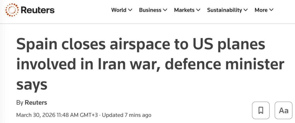 Испания закрыла своё воздушное пространство для американских самолётов, участвующих в ударах по Ирану. Об этом заявила министр обороны Маргарита Роблес. По её словам, Мадрид также не разрешает использование военных баз для любых действий, связанных с войной против Ирана, за исключением чрезвычайных ситуаций. «Мы не разрешаем ни использование военных баз, ни использование воздушного пространства для действий, связанных с войной в Иране» — подчеркнула Роблес. Министр экономики Карлос Куэрпо заявил, что это решение является частью линии испанского правительства — не участвовать и не содействовать войне, которая была начата в одностороннем порядке и в нарушение международного права. Премьер-министр Педро Санчес ранее уже называл удары США и Израиля по Ирану безрассудными и незаконными. На этом фоне президент США Дональд Трамп пригрозил Мадриду сокращением торговли, что ещё больше обострило отношения между союзниками по НАТО.