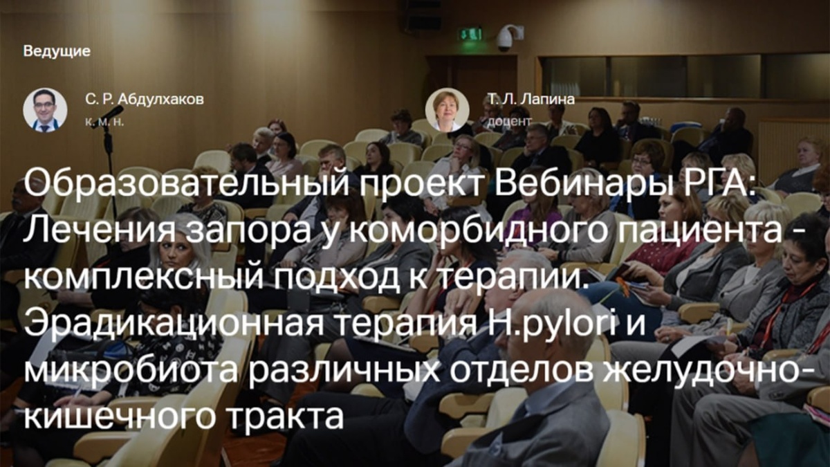 Завтра, 31 марта в 15:00 (МСК) будем ждать вас на вебинаре РГА! 🔴 РЕГИСТРАЦИЯ! 🕒 15:00-15:30 Лечение запора у коморбидного пациента - комплексный подход к терапии 🎤 Сайяр Рустамович Абдулхаков, кандидат медицинских наук, доцент, заведующий кафедрой фундаментальных основ клинической медицины Института фундаментальной медицины и биологии; Казанский (Приволжский) федеральный университет 🕞 15:30-16:00 Эрадикационная терапия H.pylori и микробиота различных отделов желудочно-кишечного тракта 🎤 Татьяна Львовна Лапина, кандидат медицинских наук, доцент кафедры пропедевтики внутренних болезней, гастроэнтерологии и гепатологии Института клинической медицины им. Н.В. Склифосовского Первого МГМУ им. И.М. Сеченова (Сеченовский Университет) 💻 УЧАСТВОВАТЬ! 📲 РГА в MAX