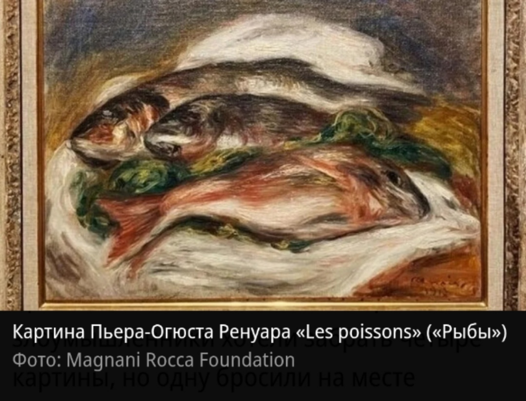 Из частной галереи Magnani Rocca Foundation неподалеку от итальянской Пармы похищены три оригинальные картины Пьера Огюста Ренуара, Анри Матисса и Поля Сезанна, общей стоимостью несколько миллионов евро. Как сообщает La Repubblica, кража произошла в ночь с 22 на 23 марта: злоумышленники хотели забрать четыре картины, но одну бросили на месте преступления. Были украдены «Рыбы» Пьера-Огюста Ренуара 1917 года, «Натюрморт с вишнями» Поля Сезанна 1890 года, а также «Одалиска на террасе», написанная Анри Матиссом в 1922 году. Расследованием занимаются карабинеры Пармы и подразделение карабинеров по охране культурного наследия. Они изучают записи с камер видеонаблюдения. В музее сообщили, что проникновение в здание и похищение длились менее трех минут. Воры действовали «в рамках структурированного и организованного процесса». Magnani Rocca Foundation является крупнейшим частным художественным музеем в Италии, где хранятся работы Тициана, Дюрера, Рубенса, Гойи, Кановы, Моне, Ренуара, Сезанна,