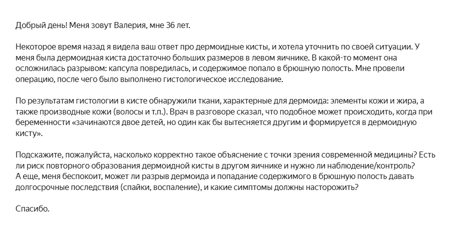 В комментариях и письмах нередко приходят не просто вопросы, а истории, после которых хочется спокойно и по-человечески всё разложить по полочкам. Одна из подписчиц поделилась именно такой ситуацией: дермоидная киста большого размера, разрыв, операция, гистология и странное объяснение о том, что «при беременности зачинаются двое детей, но один как будто вытесняется другим и превращается в кисту».