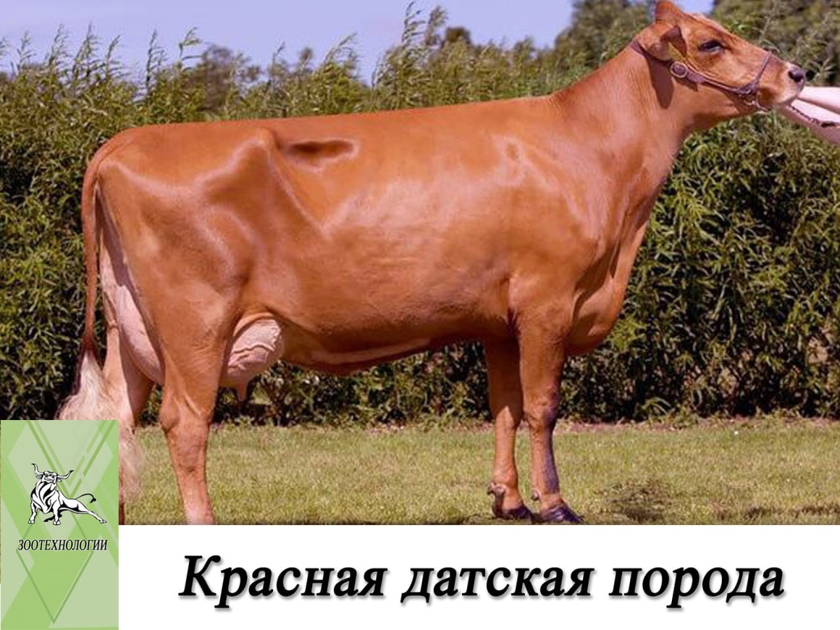 Красная датская порода коров 📖 Выведенная в 18-19 веке на территории Дании, эта порода является результатом скрещивания местного скота с северошлезвигской, англерской, шортгорнской и баллумской породами. Представители красной датской признаны одними из лучших в мире по молочной продуктивности. Ведется племенная работа, направленная на улучшение породы. 🐄 Описание породы: Коровы красной масти с белыми отметинами. Отличаются крупными размерами, крепкой конституцией, глубоким и широким туловищем, низкими ногами. Голова легкая, шиферно-серое носовое зеркало, тонкая и длинная шея. Прямая и широкая спина, выраженный подгрудок, поясница провислая. Развитые костяк и мускулатура, широкие зад и грудь, эластичная и тонкая кожа. Средний промер животных составляет: высота в холке – 128-130 см, глубина груди – 65-67 см, ширина груди – 41-43 см, косая длина туловища – 155-157 см, ширина зада в маклоках – 55 см. Вымя хорошо развито, округлой или чашеобразной формы, правильно поставленные соски ци