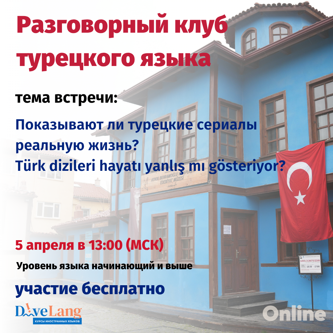 БЕСПЛАТНЫЙ РАЗГОВОРНЫЙ КЛУБ ТУРЕЦКОГО ЯЗЫКА Тема встречи: Показывают ли турецкие сериалы реальную жизнь? Türk dizileri hayatı yanlış mı gösteriyor? Встречаемся 5 АПРЕЛЯ 2026 ВОСКРЕСЕНЬЕ Начало встречи в 13:00 (время московское) Преподаватель: Алена 📍 Онлайн, в Яндекс телемост На встрече обсудим, насколько турецкие сериалы похожи на реальность. Поговорим о любви, семье, богатстве и драме - правда это или преувеличение? Вы научитесь: • выражать своё мнение на турецком • соглашаться и не соглашаться • приводить аргументы и примеры 🟡 Уровень: А1–С1 ⏱️ Длительность: 60 минут 🗨 Формат: обсуждение, живое общение, мини-дебаты Подойдёт тем, кто хочет говорить свободнее и обсуждать интересные темы. Для регистрации на встречу, переходите в Телеграм или МАХ