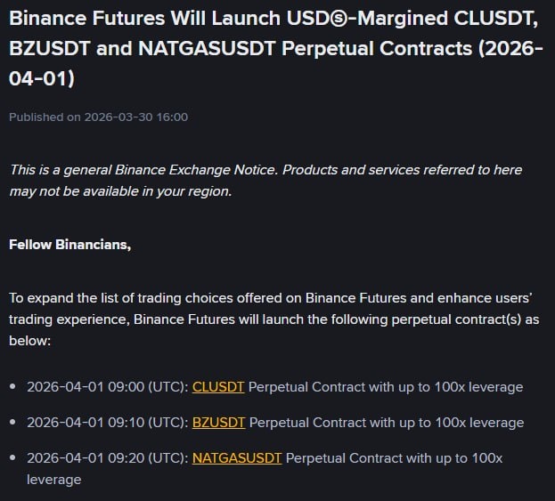 🔸1 апреля Binance Futures запустит три USDⓈ-маржинальных бессрочных контракта на сырьевые товары: CLUSDT на нефть WTI, BZUSDT на нефть Brent и NATGASUSDT на природный газ. Все три контракта будут поддерживать кредитное плечо до 100x, расчёты производятся в USDT.
