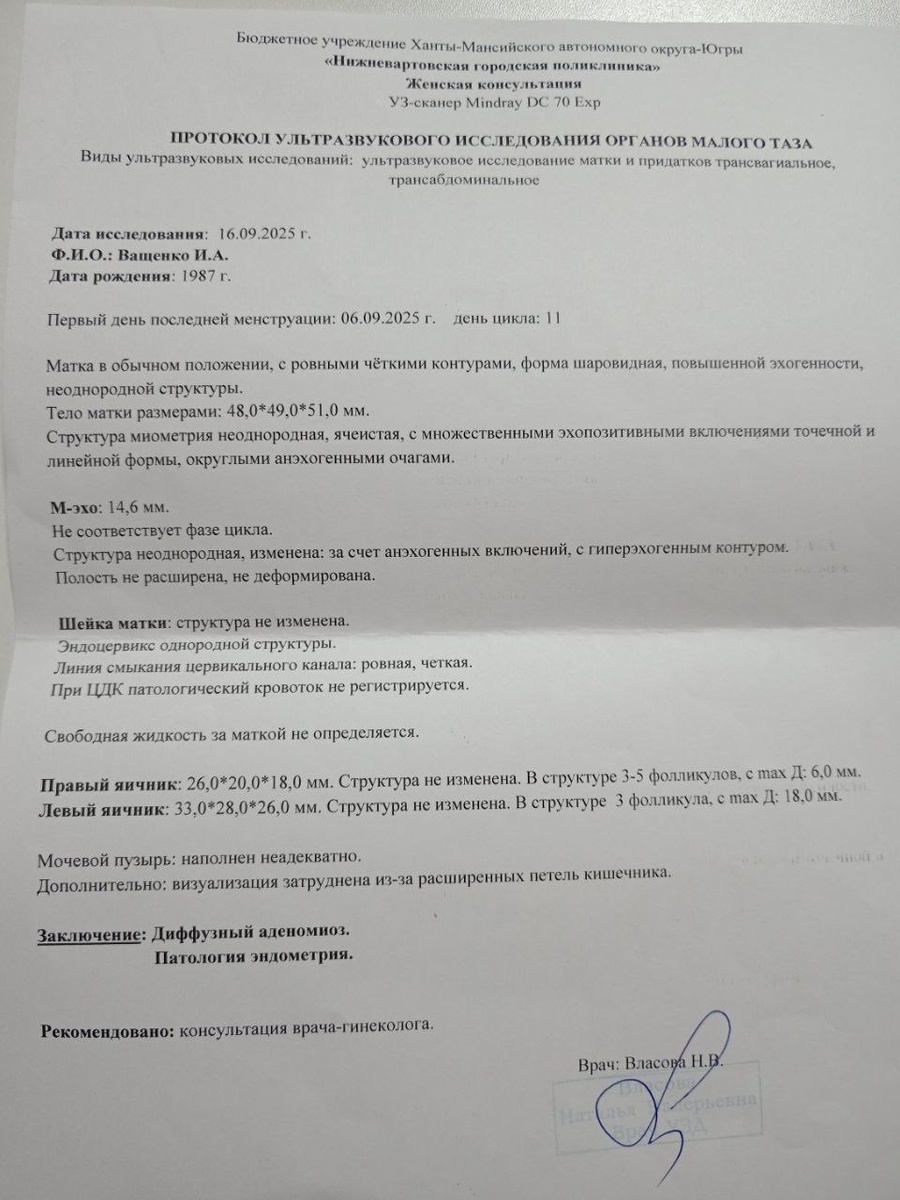 Хочу поделиться отзывом с девушками об эндометриозе. Не так давно услышала это в свой адрес на УЗИ (16.09.2025). У меня выявили вид эндометриоза: аденомиоз, диффузный, когда эндометрий вростает в мышечную ткань матки. И поставили патологию с вопросом на хирургическое вмешательство, и в планах гинеколога гормоны КОК. Сначала назначили повторное УЗИ на 5-7 день цикла. Оно состоялось 06.10.2025, (правда 4ый день цикла). Итог: патологию сняли, эндометриоз пока оставили, наблюдать через 6 месяцев, матка очистилась, но ещё не полностью, прошло 2,5 недели. Что я делала: (обязательно) Ортилия и зимболюка 2 капс Новомин 4 капс Медвежьи ушки 1 капс (выводить лишние эстроген, от которых растёт эндометрий) Сибирский Лен и омега 3, 2 капс Эпам 31 Эпам 24 Чай женское здоровье Дикий ямс - только Ямс (оранжевые капсулы), это прогестерон, его не хватает при эндометриозе. Первую половину изофлавтны сои - в мусорку (это эстрогены, их и так много) Омега северная, 3 капс