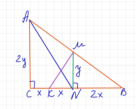 катета BC соответственно,точкаK отмечена на катете BC так, чтоCK : KB = 1 : 3.