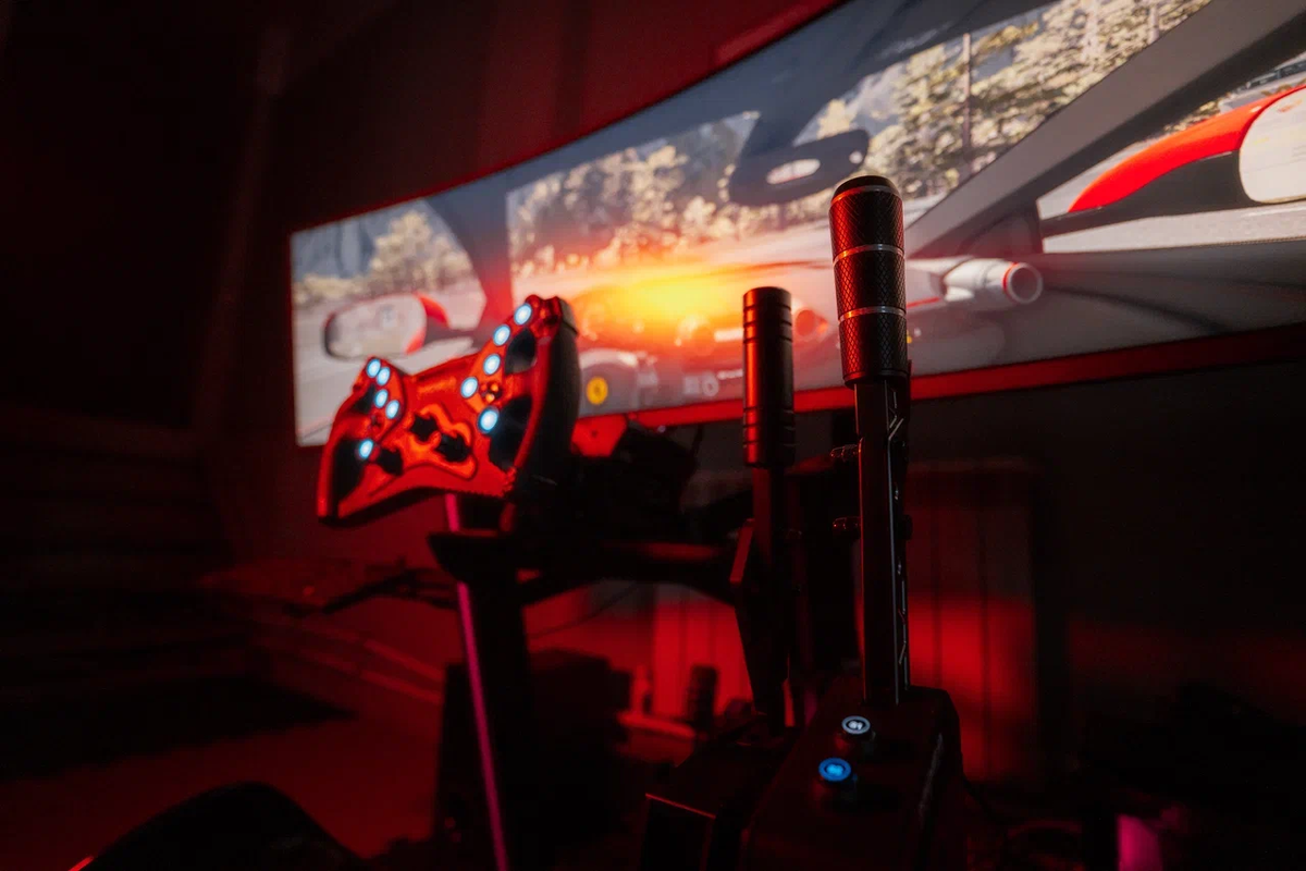 Вместе с тензометрическими педалями и мощным рулём ковш создаёт ощущение, что вы внутри настоящего болида, а не просто сидите за столом с рулём.